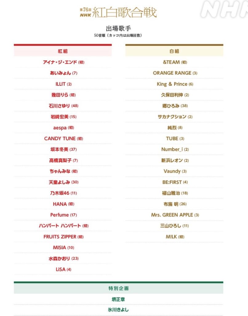 11月14日、『第76回NHK紅白歌合戦』の出場歌手37組が発表された。