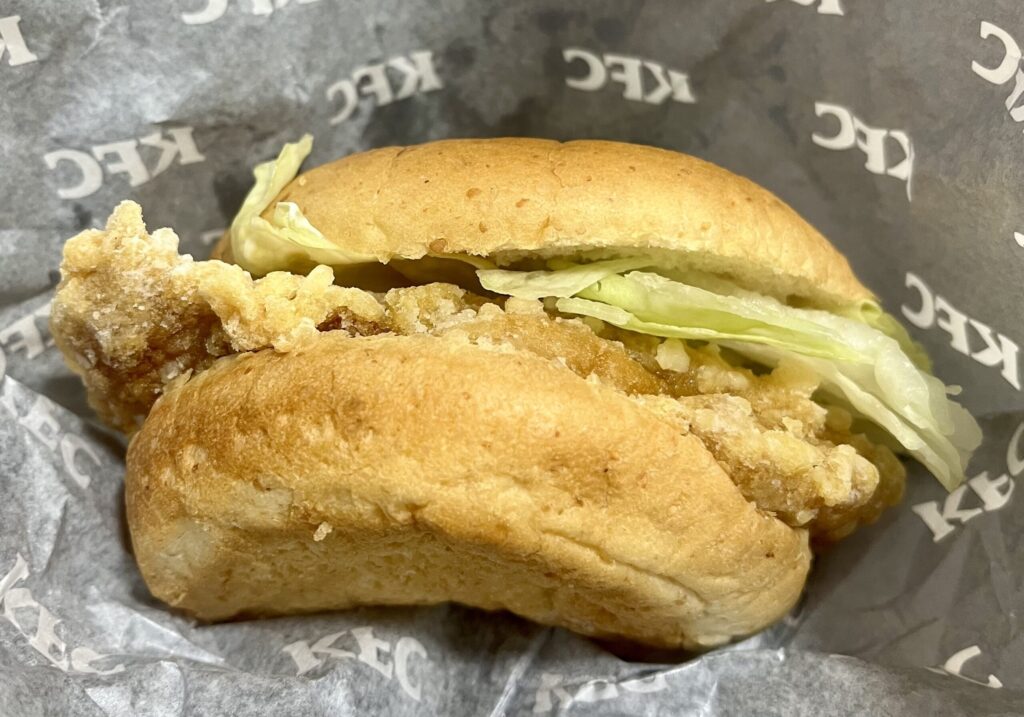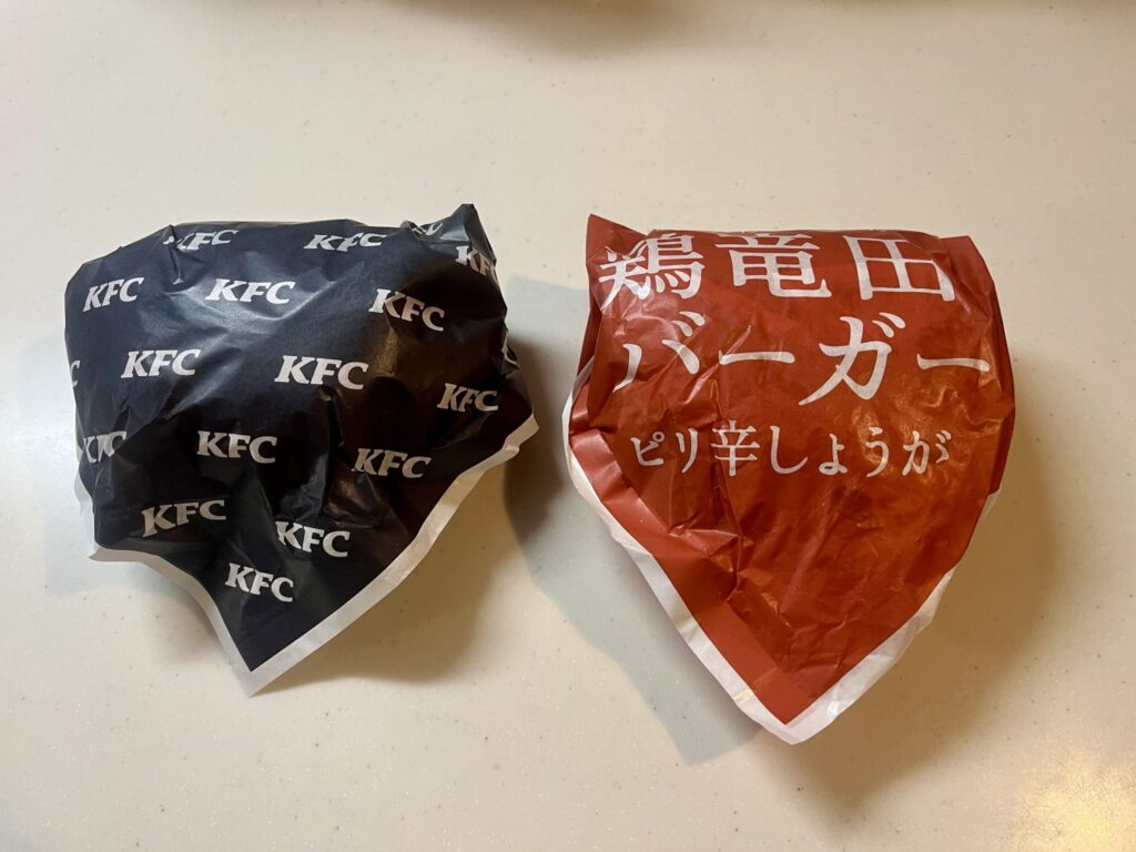 鶏竜田バーガーの方はシンプルにKFCのロゴが書かれた紙で包まれていました。SNSを見ると、黄金色の包み紙で鶏竜田バーガーと書かれたものが存在するようなので、もしかしたら、数量限定のため包み紙の在庫が切れているのかもしれませんね。