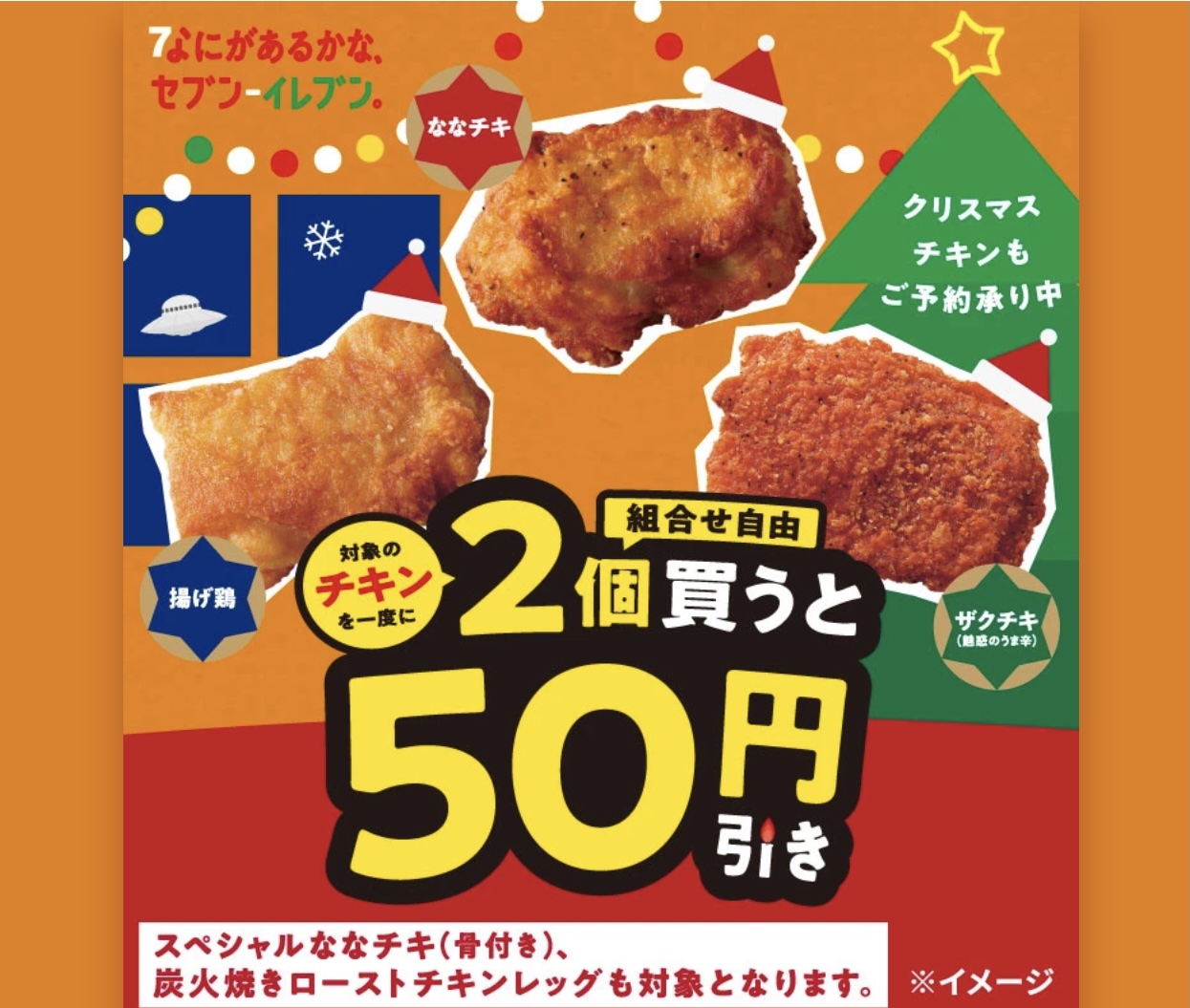 セブン-イレブンでは、12月7日(日)から12月11日(木)までの期間中、対象のチキンを一度に2個(組合せ自由)買うと50円引きになるキャンペーンを行っています。