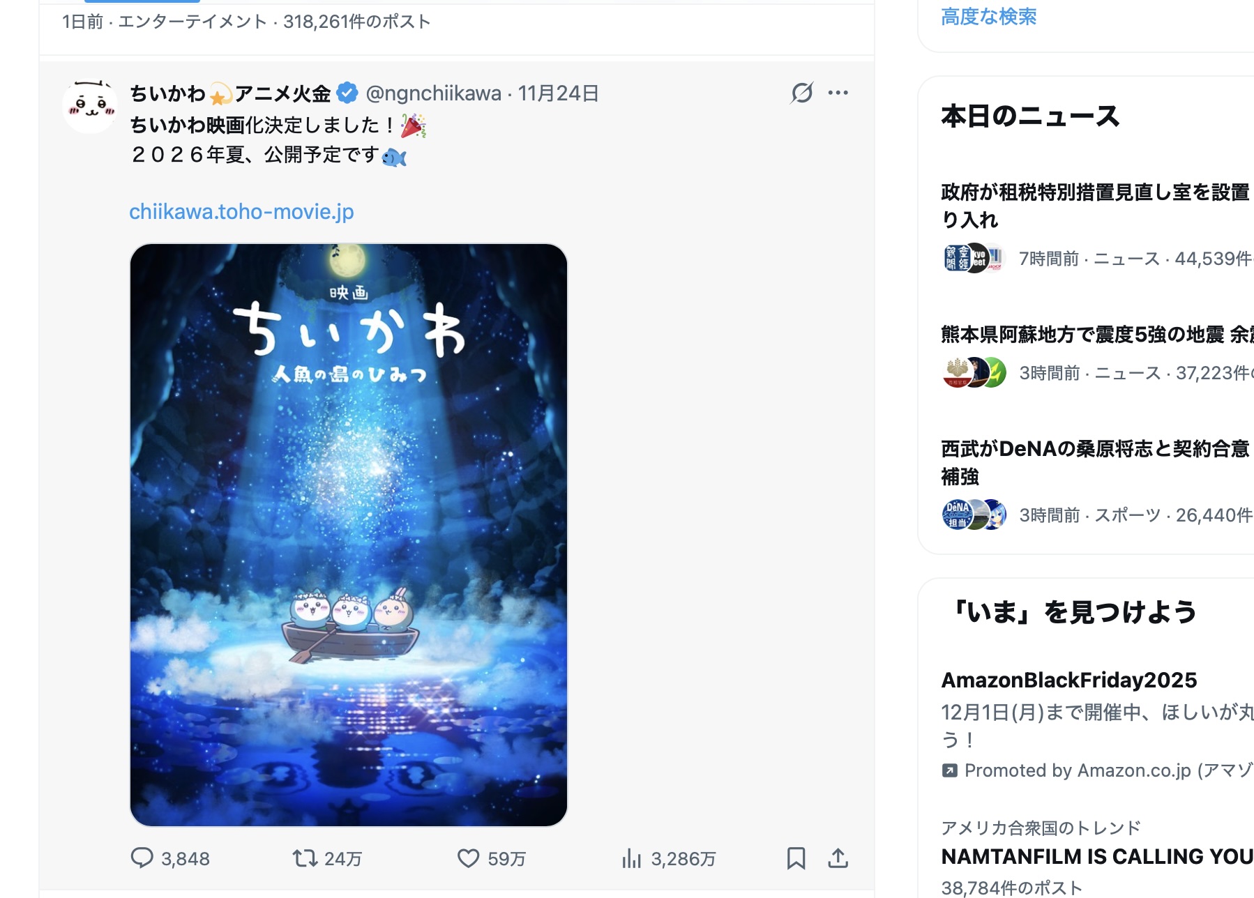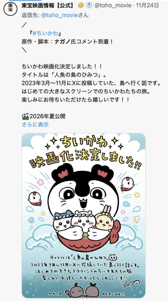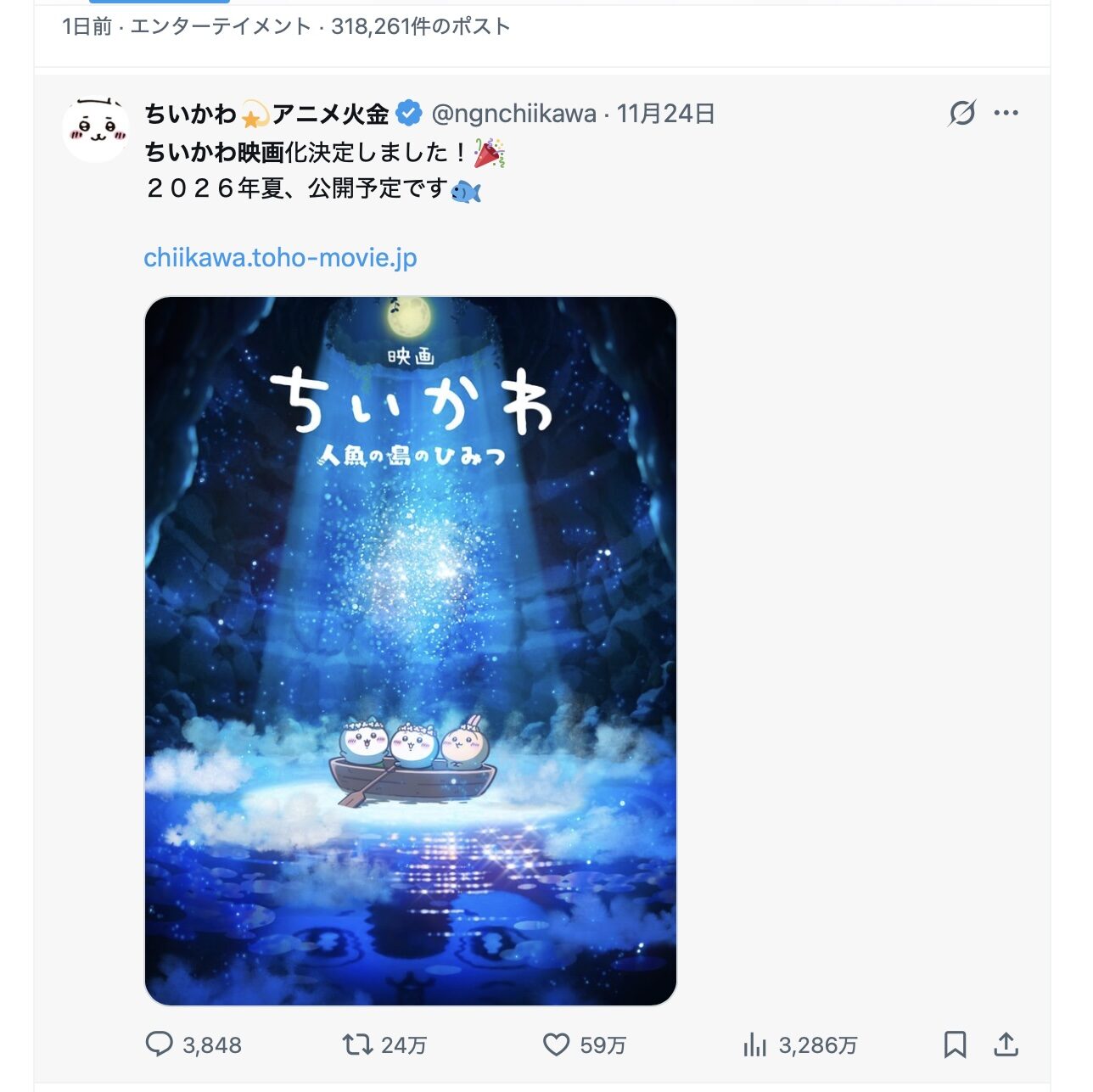 「映画ちいかわ 人魚の島のひみつ」を発表したちいかわ公式のXのポストには2025年11月25日現在、約60万ものいいねが集まっていて、初の映画化ということもあり注目度の高さが伺えます。