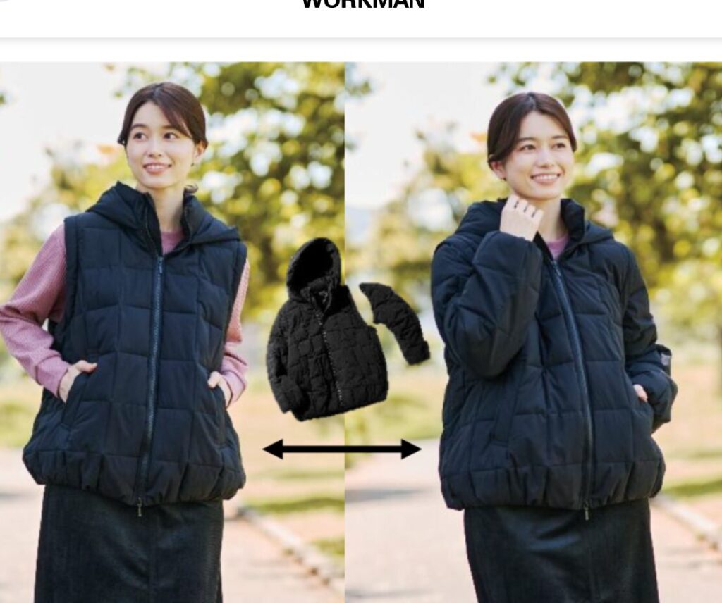 その日の気分や気温にあわせて長袖とベストの2Wayスタイルが楽しめる高撥水&高保湿の「デタッチャブルパフィーブルゾン」は3900円、レディースM~LL、4色展開。