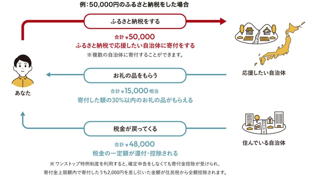 寄附へのお礼として自治体から返礼品が贈られる。各自治体は寄附金額の3割以内に相当する返礼品を用意しており、地域ならではの特産品や工芸品、さらには宿泊券や体験チケットなど多彩な品々を揃えている。