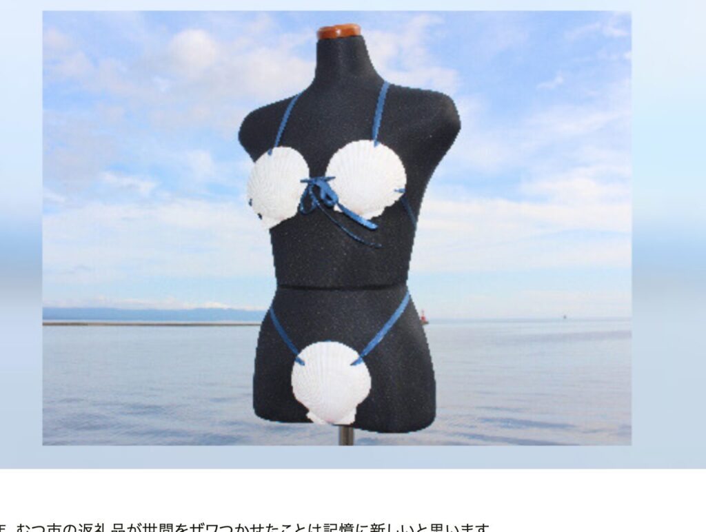青森県むつ市の返礼品の一つとして2021年に話題になった「ホタテ水着」。大畑町にある阿部商店で制作しており、本物のホタテの貝殻を使用している。