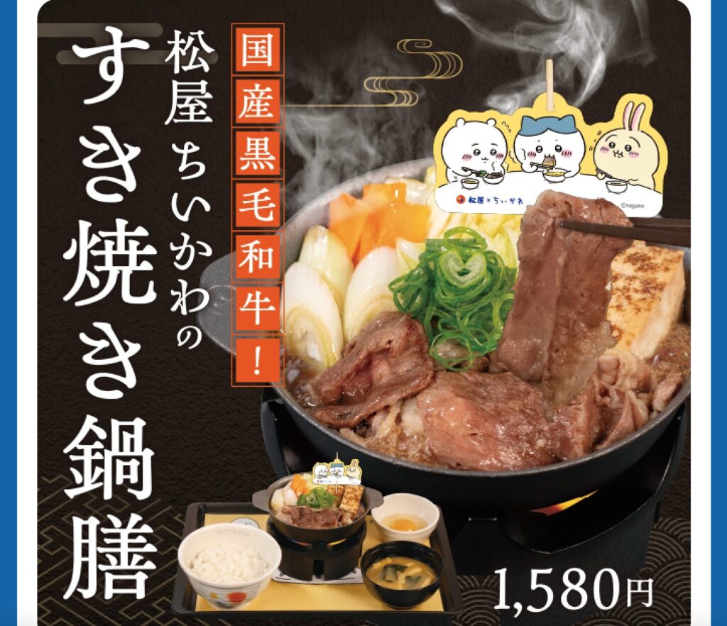 第1弾として国産黒毛和牛を使用した「松屋 ちいかわのすき焼き鍋膳」を販売。コラボメニュー1品の注文につき、「松屋」×『ちいかわ』コラボ限定「オリジナル食券キーホルダー」(デザインは全6種類)が1個、ランダムでプレゼントされる。