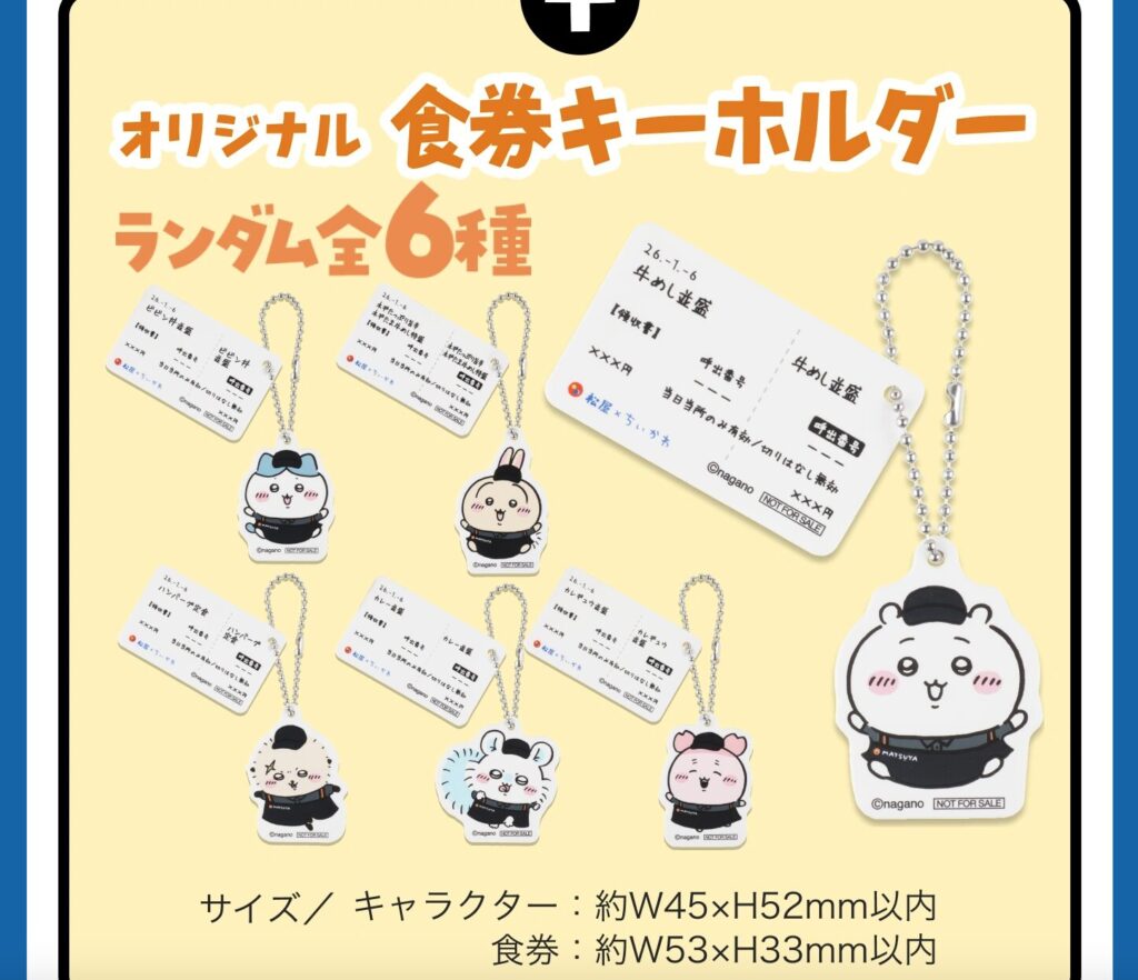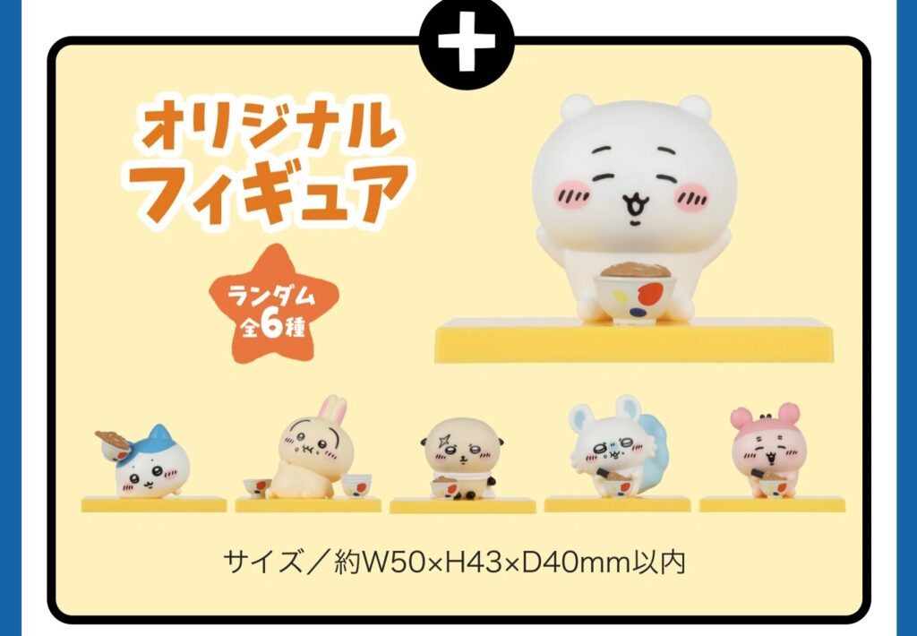 コラボメニュー1品の注文につき、「松屋」×『ちいかわ』コラボ限定「オリジナルフィギュア」(デザインは全6種類)が1個、ランダムでプレゼントされる。