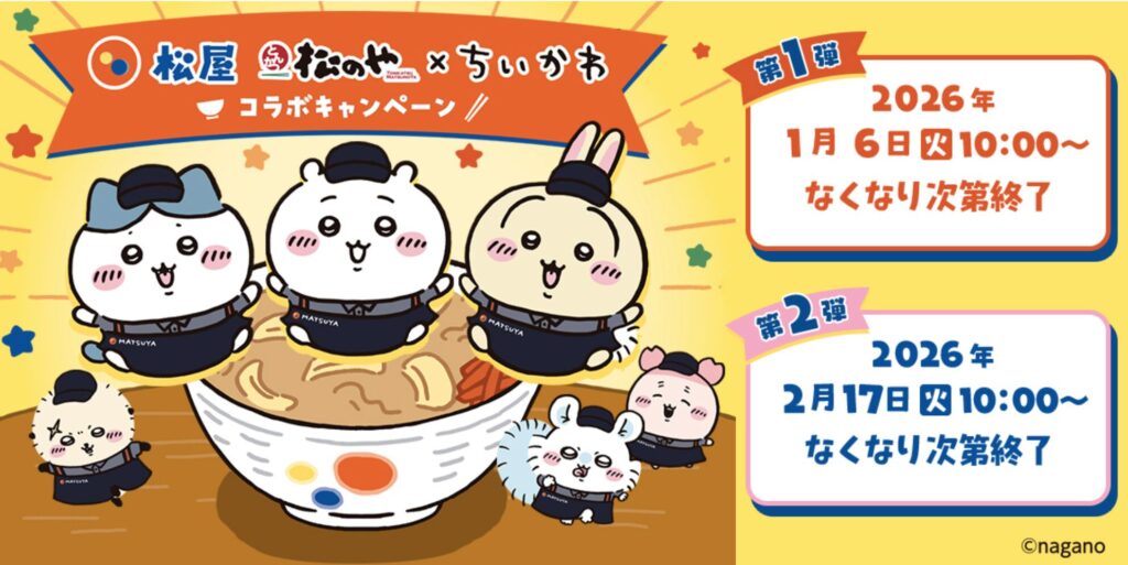 24日、牛めし・カレーなどの「松屋」・とんかつなどの「松のや」でお馴染みの「松屋フーズ」は、大人気キャラクター『ちいかわ』とのコラボ企画を発表。