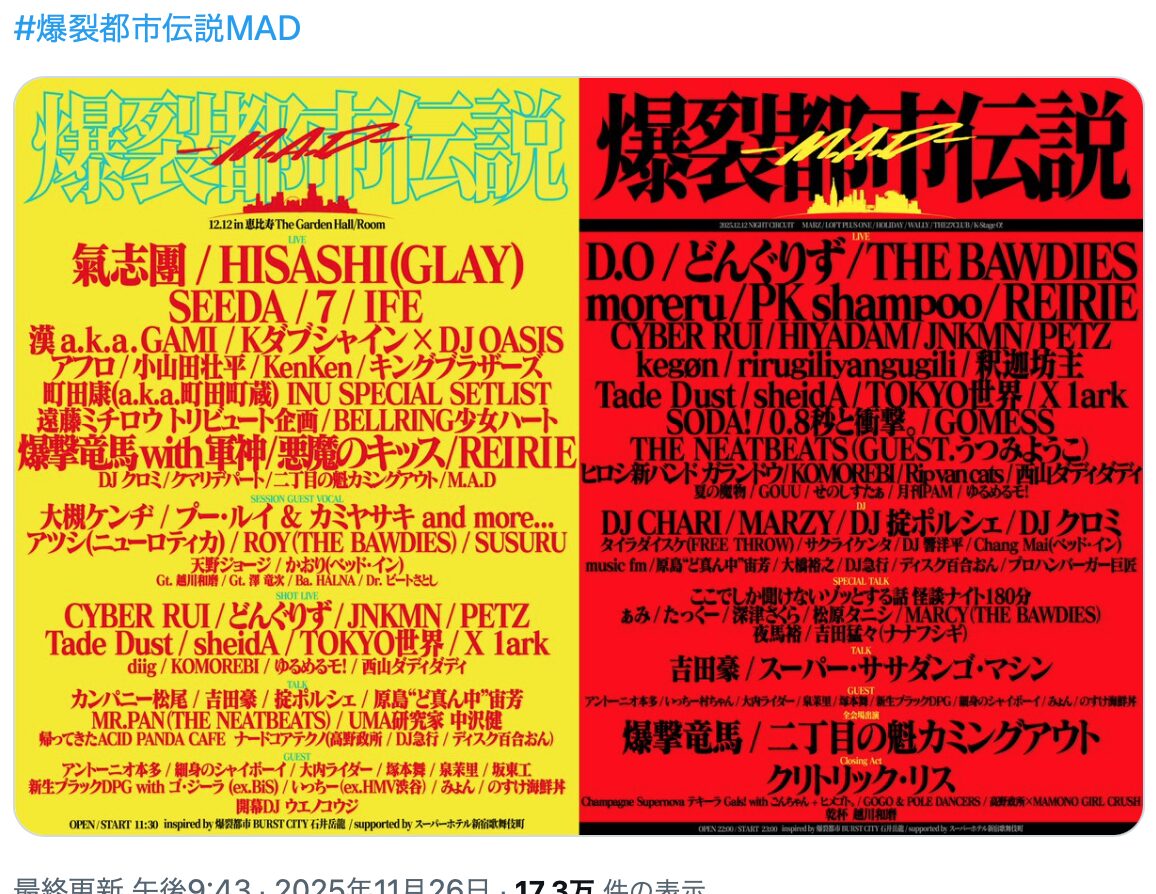 26日に公式Xにて「”爆裂都市伝説M.A.D Zepp Shinjuku”について、規模を拡大し、会場変更となりました」「会場変更に伴い、 出演者の一部変更がございます。 最新の出演者をご確認の上、ご購入ください」と案内され、【昼の部】の会場がZepp Shinjyukuから「恵比寿GardenHall/Room」に変更。