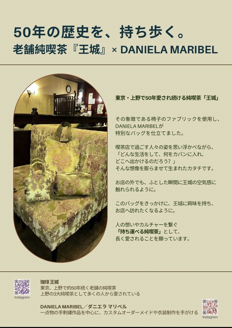 木村カエラさんの衣装を制作するなど 刺繡アートを中心に多彩な才能を持たれるデザイナー #ダニエラマリベル さんに企画 制作していだいた #珈琲王城オリジナルバッグ が、 12/6~7の2日間、新宿の #ビームスジャパン 4階 〈TOKYO CULTUART by BEAMS〉 にて行われるポップアップイベントで 初お披露目(販売)されることになりました! 期間中、当店の椅子も一脚 展示させていただきます。