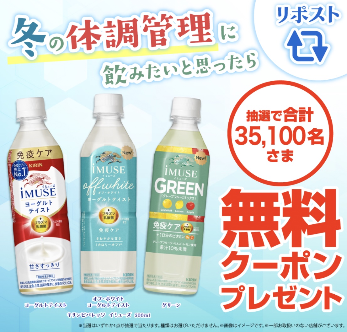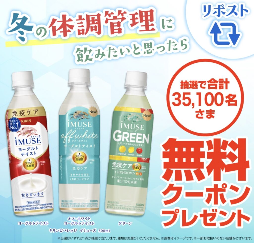 「イミューズ」3種類のうちいずれか1つの無料クーポンが当たります。