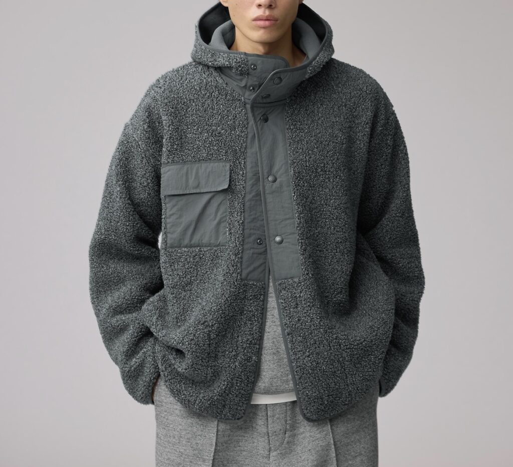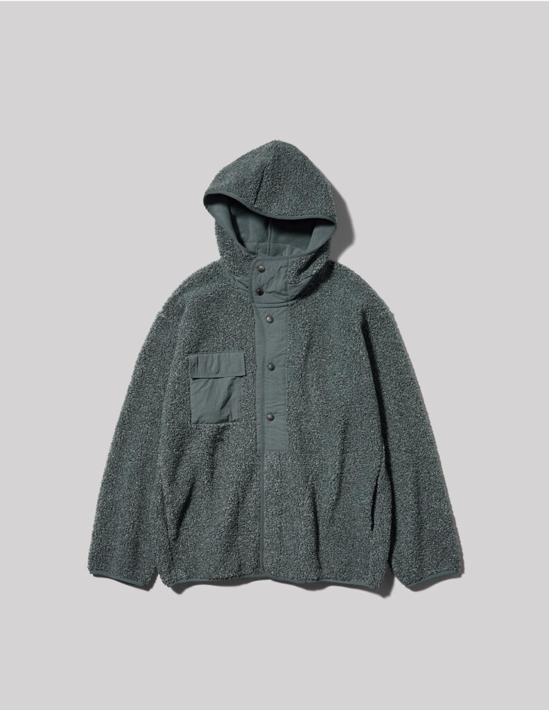 ミリタリーテイストのボアブルゾン。ダークトーンのボア生地とナイロンタフタを切り替えた、異素材組み合わせのデザインが特徴。一見プルオーバーのように見えるが前開きのジャケット仕様になっており、スタイルや気温にあわせて着脱しやすい。一番上のボタンのみを留めてラフに着たり、すべてのボタンを留めてフーディーのようなスタイルで着たりと様々な着方を楽しめるので、秋冬の着まわしに活躍してくれそう。