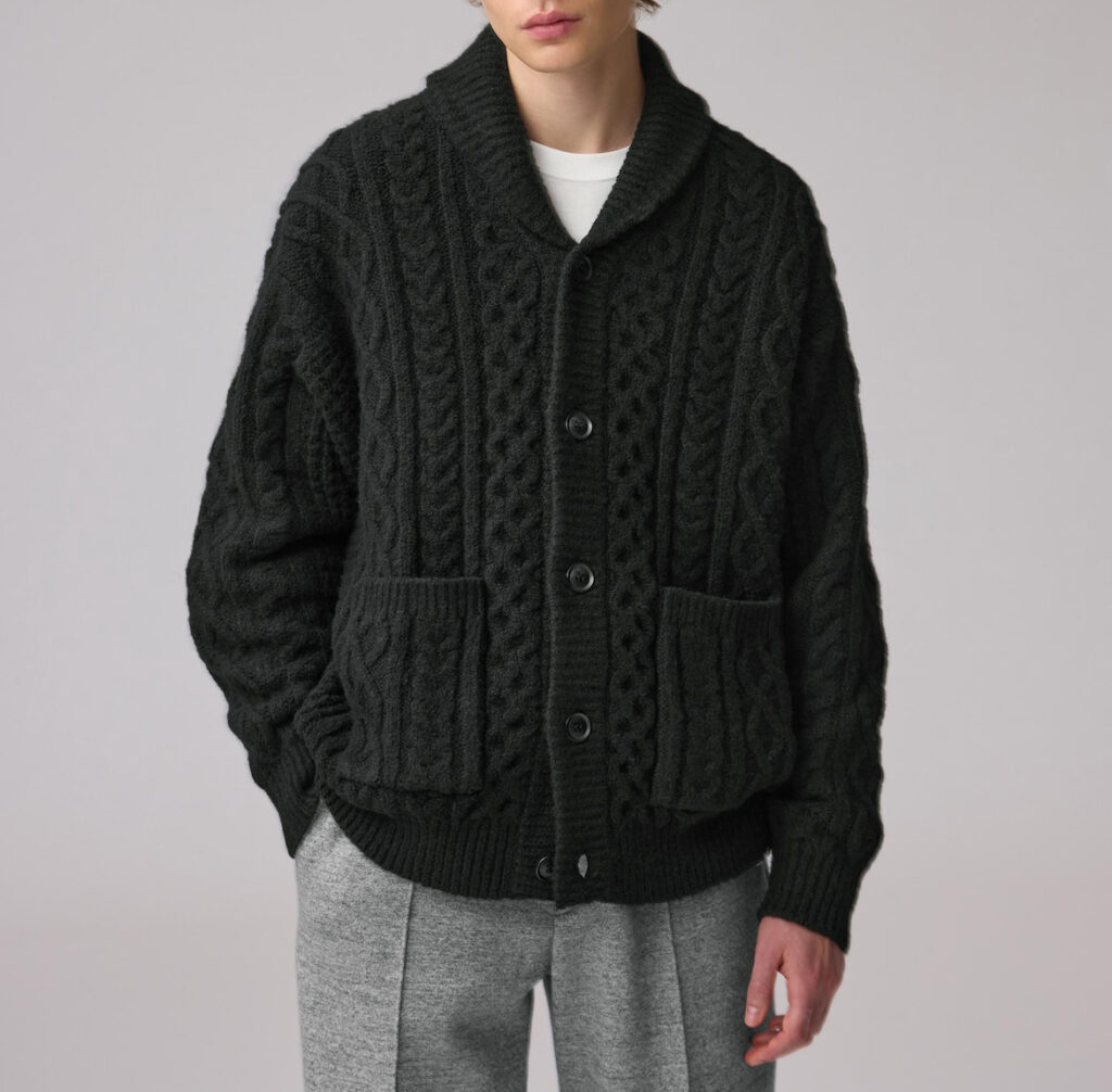 ざっくりとした大きな編み目のケーブル編みとショールカラーを組み合わせた、ゆったりフォルムのニットカーディガン。肘部分に編み地で配されたエルボーパッチが、デザインにアクセントをもたらしている。襟の裏に隠しボタンが配されており、ボタンを留めると襟の幅を狭くして表情を変えることができる。