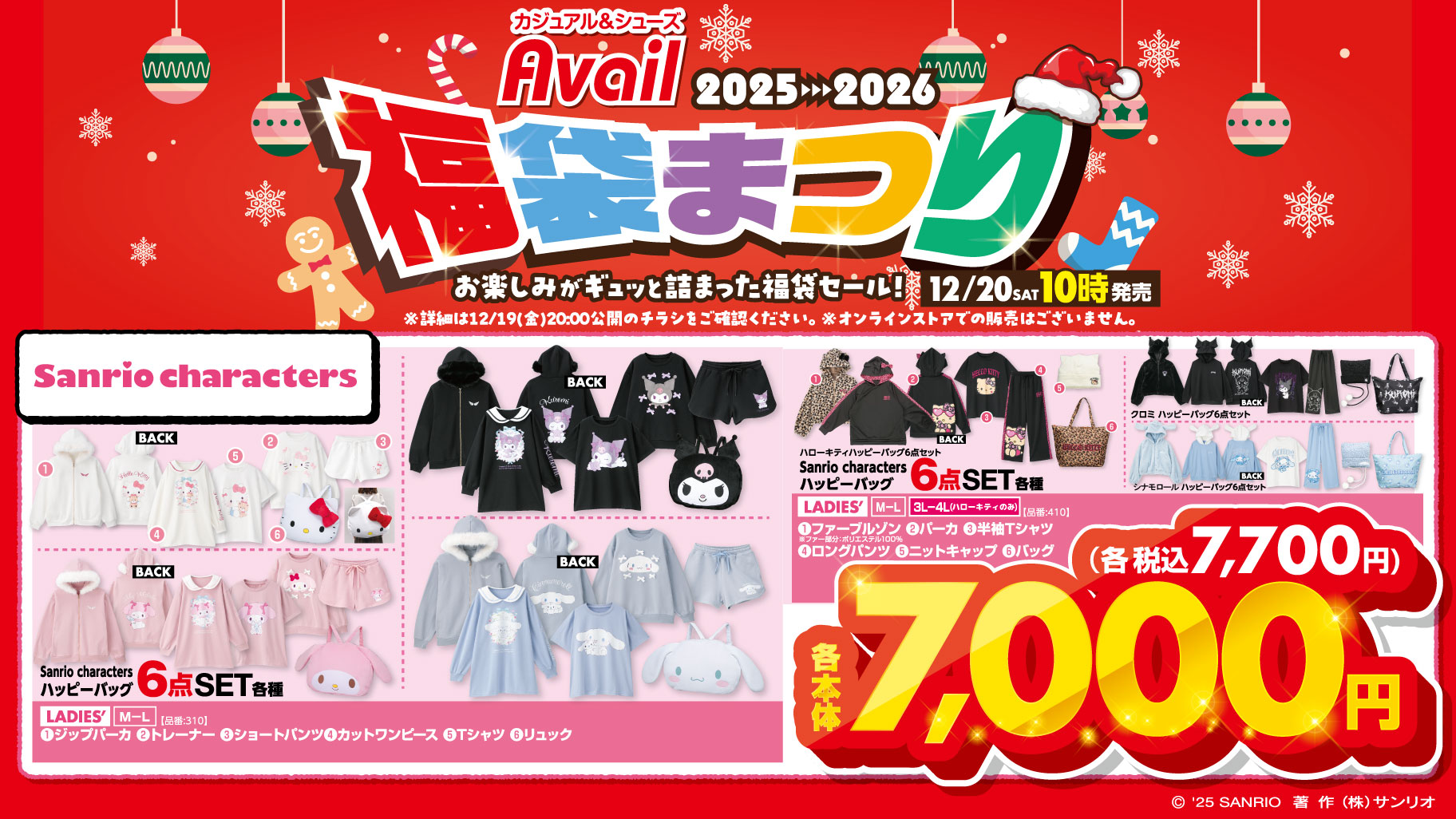 サンリオキャラクターズの福袋が、2025年12月20日(土)10:00より全国のアベイル店舗にて発売される。