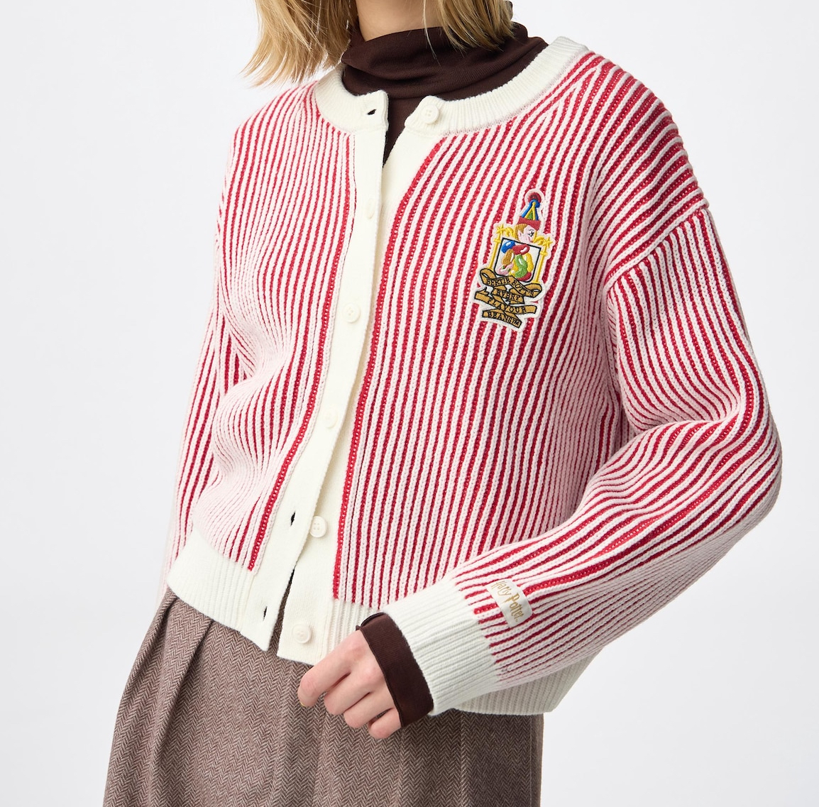 ハニーデュークスで人気のお菓子、バーティー・ボッツの百味ビーンズのパッケージをイメージした配色と刺繍ワッペンがポイントのカーディガン。袖には「ハリー・ポッター」のタグ付き。