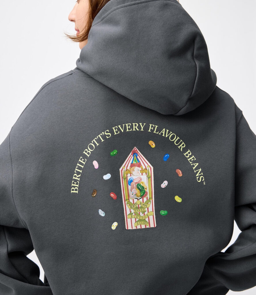 作品でおなじみのホグワーツ魔法魔術学校の生徒たちに大人気のハニーデュークス菓子店をデザインに取り入れたコレクション。フロントにはハニーデュークスのロゴ、バックにはお店で人気のお菓子、バーティー・ボッツの百味ビーンズのパッケージのイラストがプリントされたスウェットパーカ。袖には「ハリー・ポッター」のタグ付き。膨らみのある裏起毛のヘビーウェイトスウェットを使用。