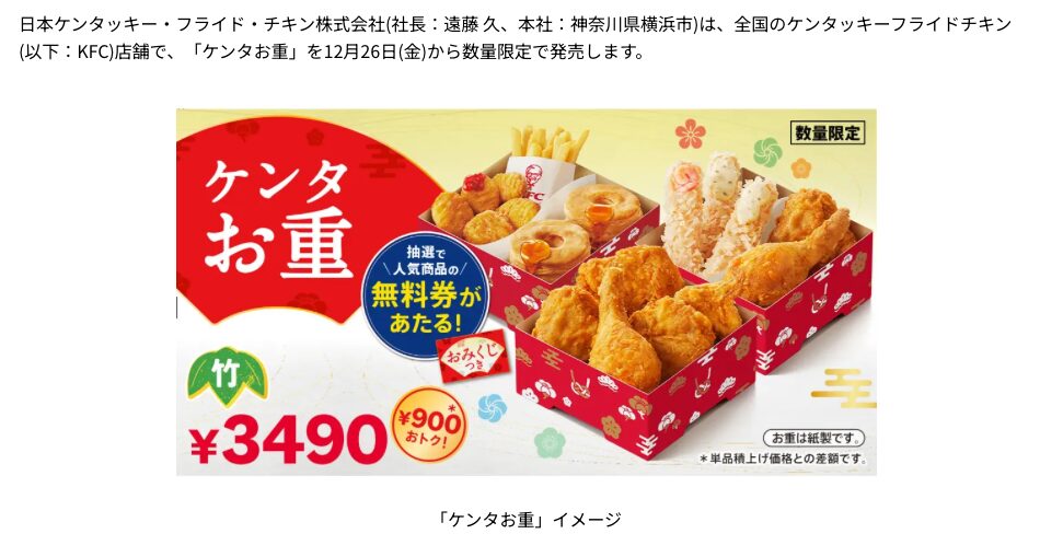 そしてなんとケンタッキーでは「ケンタお重」というKFCの看板メニュー「オリジナルチキン」をはじめ、幅広い世代に愛される「ビスケット」「ナゲット」「ポテト」、さらに迎春にぴったりな”えび”を使った「えびぷりぷりフライ」を重箱に詰め込んだ、贅沢なラインアップが12月26日(金)から数量限定で発売されるそうです!