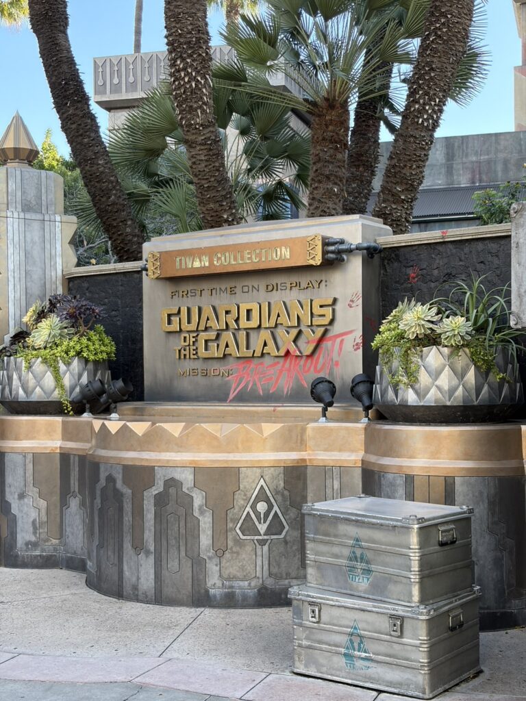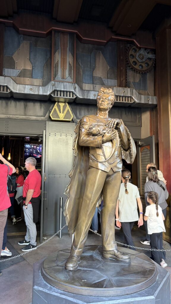 早速中に入ると、堂々としたコレクターの金色の銅像がありました。どうやらここは、コレクターの館の様であります。コレクターの庭なのでしょうか、外をぐるぐると並び、やっと館へと足を踏み入れました。コレクションがズラリと並んでいます。中にはウルトロンや、ヘイルダムの鎧なんかもありました。他にもマレキスのお面や、コスモもいます。ファンにはたまらないですね。そして大画面には、ガーディアンズのメンバーが映されており、ちゃんと映画と同じキャストなのことに感動しました。またこのメンバーの絡みが見れるなんて、それだけで来た甲斐があります。