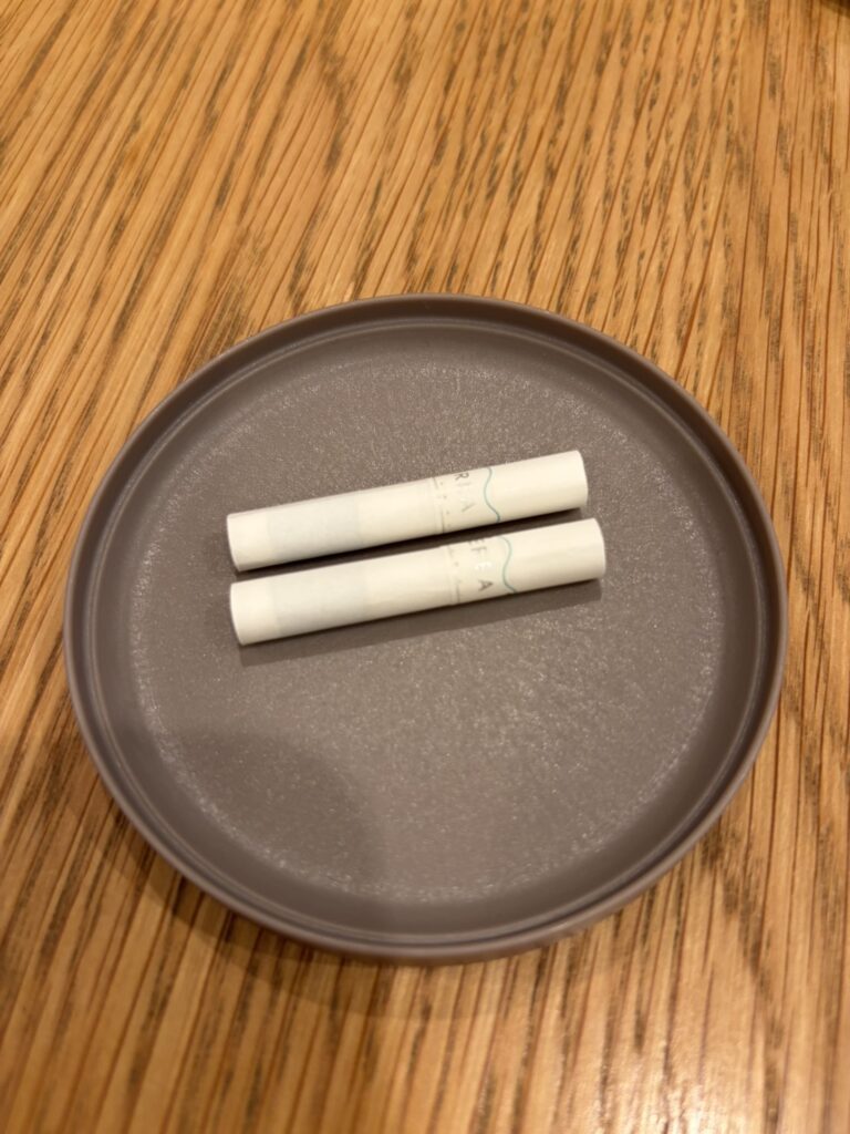 IQOSユーザーの筆者は早速行ってみることにしました。2階へ案内され席に着くと、まずはIQOSスティックをどれでも2本もらうことができます。お得すぎます。IQOS専用みたいなお皿にのって登場しました。