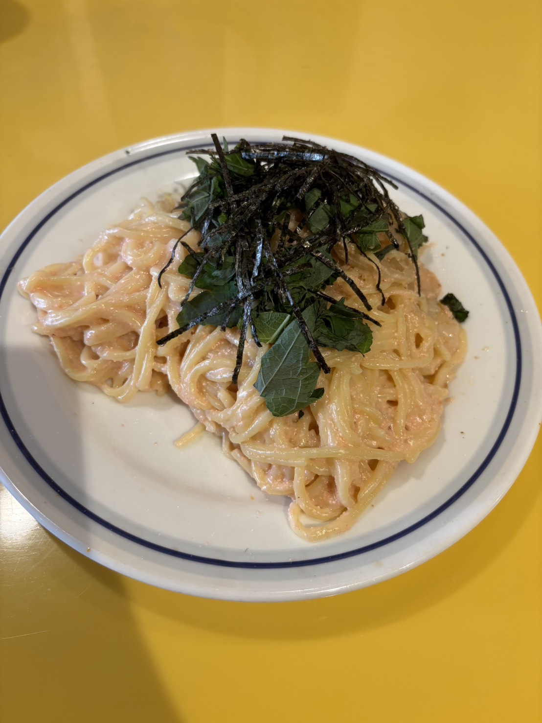 筆者はたらこクリームを選びました。混雑していたので、本でも読んでのんびり待とうかなと思ったのも束の間、すぐに出てきました。ありがたいです。目の前に置かれた、たらこクリームスパゲティを見て驚きました。めちゃくちゃでかいです。美味しそうな湯気がモクモクと立ち昇っています。早速いただいてみましょう。