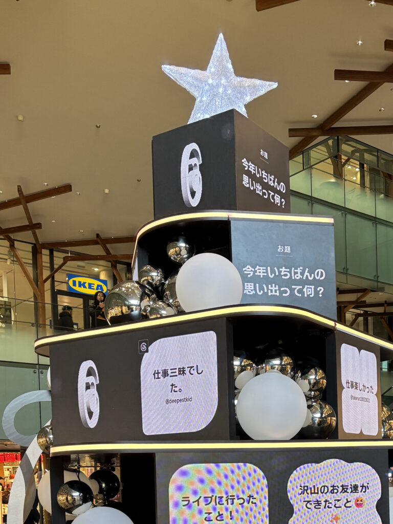 今回のイベントの主役は、Threadsの投稿とリアルタイムで連動する巨大クリスマスツリー型モニター!