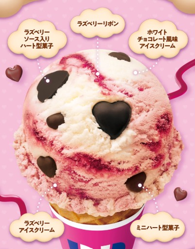 ラズベリーアイスクリームとホワイトチョコレート風味アイスクリームをベースに「ラズベリーソース入りハート型菓子」「ミニハート型菓子」が散りばめられている。また「ラズベリーリボン」もいいアクセントに。